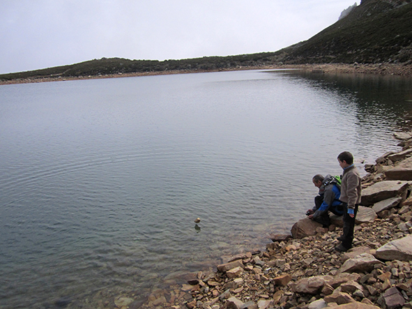 y luego a la derecha, siguiendo un mínimo senderillo, comenzamos a descender hacia la cubeta del lago