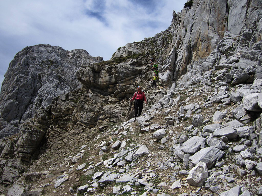 una vez estamos en la ruta ya habitual, nos queda desplazarnos al NE, siguiendo sendero bastante claro y bien hitado, hasta que nos encontramos con este bonito y peculiar paso, una vira en ascenso, por roca limpia y en donde es necesario apoyar bien las manos, existe otra alternativa, que es perdiendo un poco de altura y por donde es más sencillo, sobre todo si la roca está húmeda